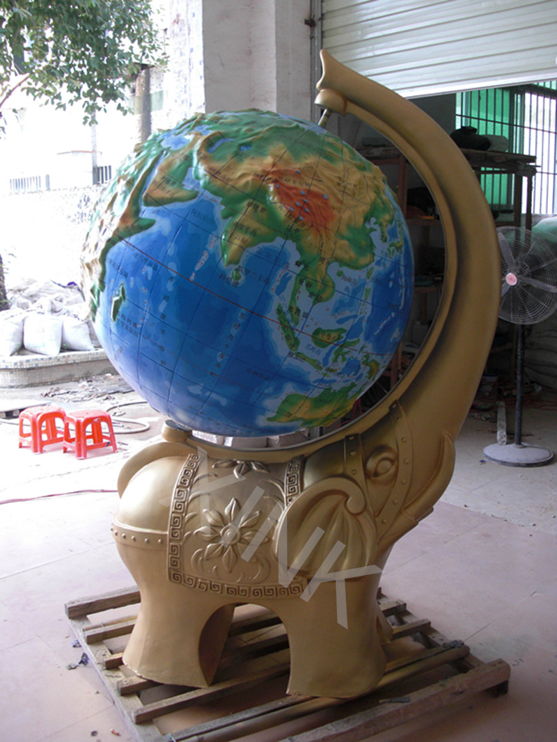 1米象座地球儀模型采用高分子復合材料制作,以有色無機物為填充料,阻燃性好,采用多層泊金纖維,一次性高壓成形,平均厚度7mm以上。具有密度高、強度高、收縮性好,不易龜裂變形。采用高級汽車油漆烤漆,表面使用高級汽車水晶漆保護,經得起風吹,日曬,雨淋不退色.大小比例協調,實用性較強,不易損壞,維修方便教學元素:1.七大洲,包括地形概況.四大洋:包括位置、面積、深度、地理分區、海底地形、島嶼等。識別功能:球體表示的文字是采用鏤空字體進行噴漆標注,大小比例協調,內容詳細,實用性較強。底座為大象仿銅藝術造型。