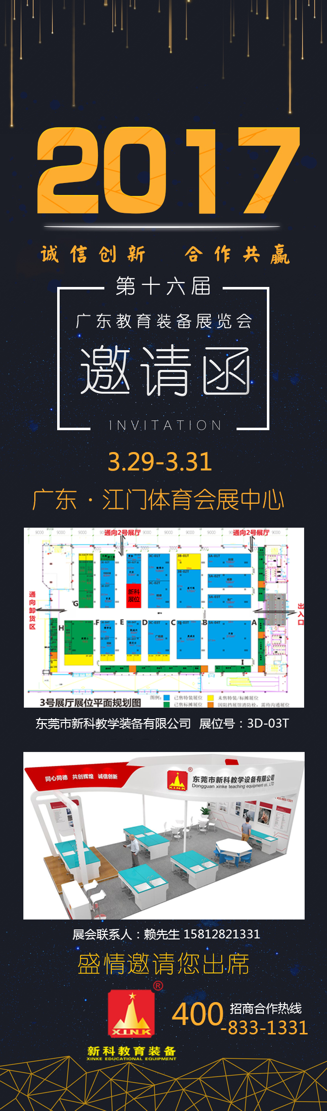 2017年3月29日至31日,由第十六屆廣東教育裝備展覽會暨第二屆江門·臺灣教育裝備展覽會,新科將攜帶一系列未來創客教室、創新實驗室產品、機器人、3D打印機、VR、數字書法室解決方案亮相該展會,展位號為3D-03T。誠邀蒞臨各界朋友及新老客戶前來參觀指導。